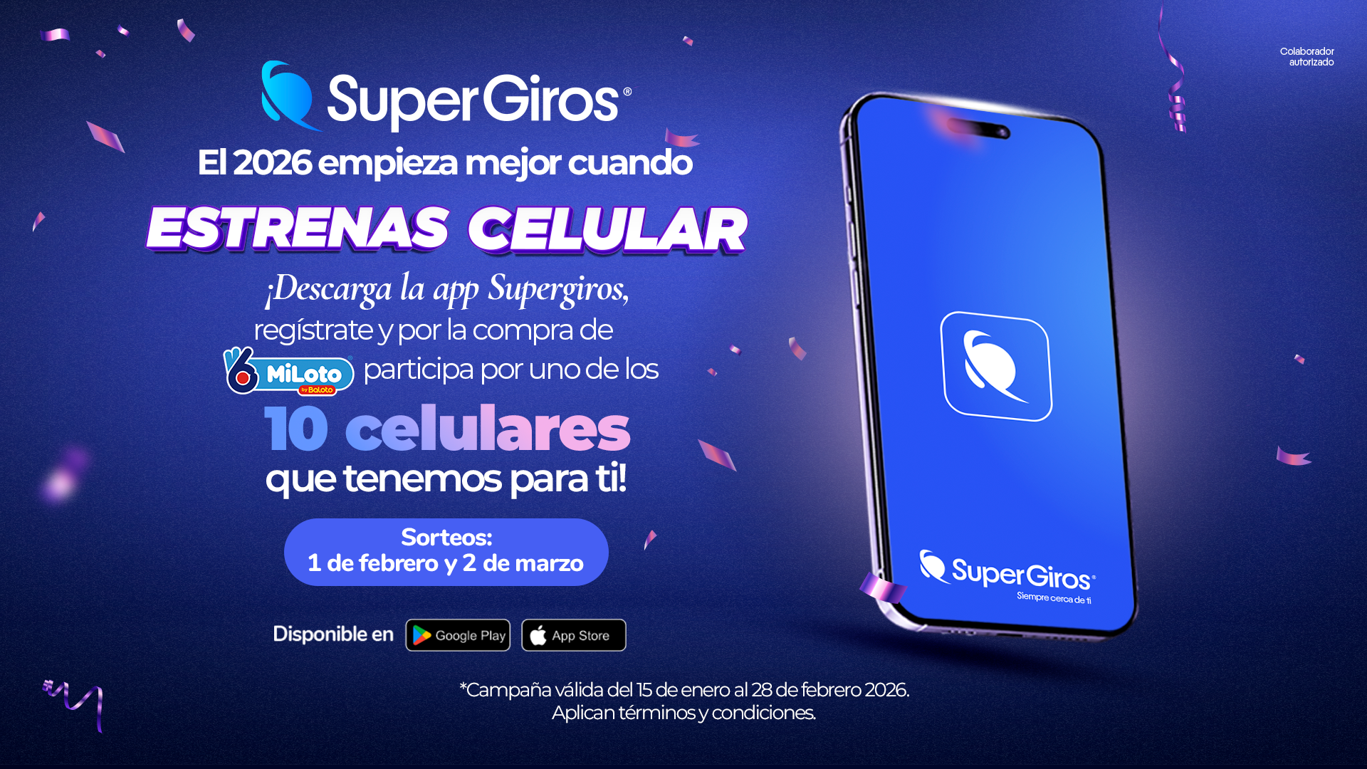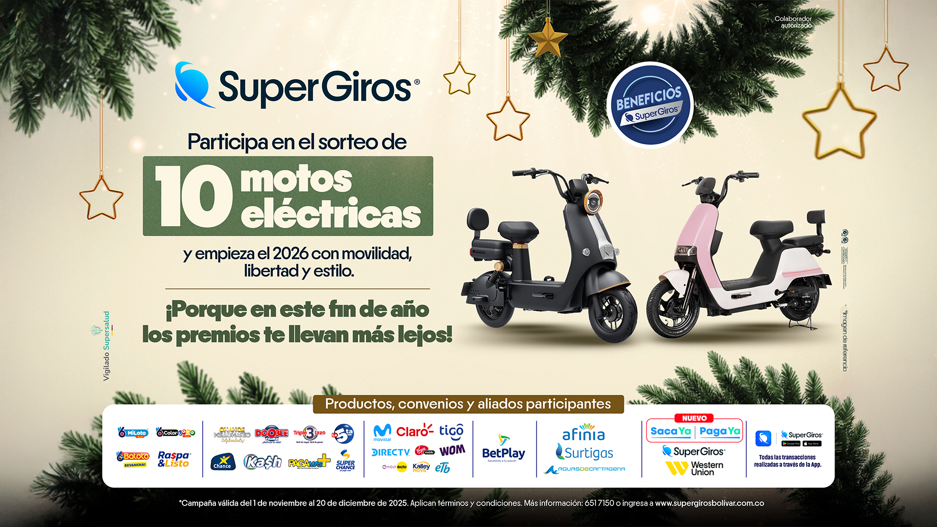 Campaña promocional de SuperGiros Bolívar dirigida a usuarios mayores de edad en Bolívar, vigente del 15 de enero al 28 de febrero de 2026, en la que podrán participar por uno de lTyC Campaña "Estrena Celular"Lee aquíCampañas y promocionalesParticipa en la campaña Regreso a Clases de SuperGiros válida en el departamento de Bolívar del 1 de enero al 28 de febrero de 2026. Al realizar transacciones en puntos físicos o dTyC Regreso a ClasesLee aquíCampañas y promocionalesGana una de 10 motos eléctricas Mobula con SuperGiros Bolívar. Vigencia del 1 de noviembre al 20 de diciembre de 2025. TyC Campaña 10 motos eléctricas - No vigenteLee aquíCampañas y promocionales